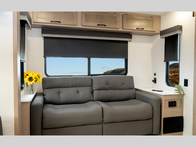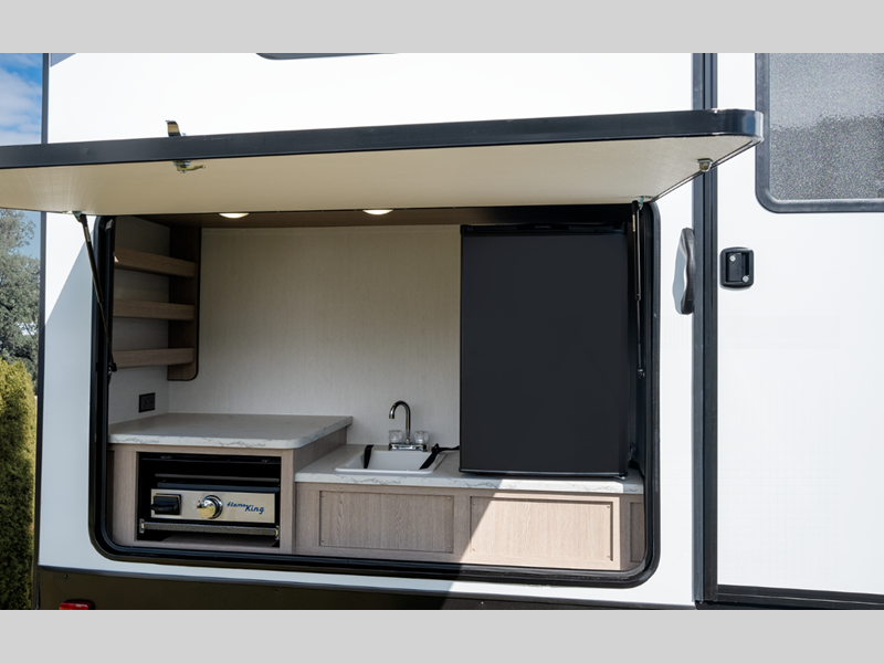 Inside each model you'll enjoy larger slide windows for beautiful outdoor views, hi-performance wood grain vinyl flooring, plus extensive storage throughout for all your belongings. The handcrafted cabinetry is sure to make you feel right at home, and the chef of your group will love the full kitchen to cook their best meals in. The Supreme Package comes standard on each model and includes an electric awning with LED lights, an outside shower, a tankless water heater, and more!