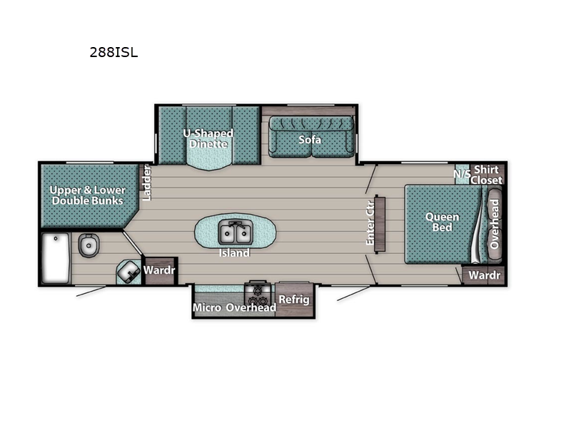 Sleeps 9 Slides 2 Length 33 ft Ext Width 8 ft Ext Height 10 ft 9 in Int Height 6 ft 8 in Hitch Weight 910 lbs Dry Weight 6660 lbs Cargo Capacity 1820 lbs Fresh Water Capacity 35 gals Grey Water Capacity 67 gals Black Water Capacity 33 gals Furnace BTU 30000 btu Number Of Bunks 2 Available Beds Queen Refrigerator Type 12V Refrigerator Size 10.7 cu ft Cooktop Burners 3 Number of Awnings 1 LP Tank Capacity 20 lbs Water Heater Type Tankless AC BTU 13500 btu Awning Info Electric with LED Lights Axle Count 2 Number of LP Tanks 2 Shower Type Tub/Shower Combo Electrical Service 30 amp Similar Floorplans