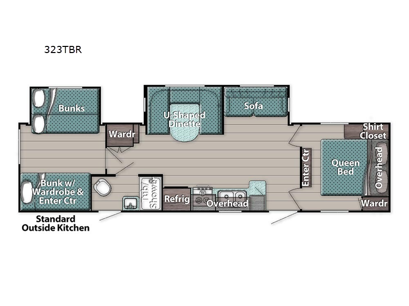 Sleeps 9 Slides 1 Length 32 ft 2 in Ext Width 8 ft Ext Height 11 ft 3 in Int Height 6 ft 8 in Hitch Weight 750 lbs Dry Weight 5680 lbs Cargo Capacity 3870 lbs Fresh Water Capacity 35 gals Grey Water Capacity 67 gals Black Water Capacity 33 gals Furnace BTU 25000 btu Number Of Bunks 2 Available Beds Queen Refrigerator Type 12V Refrigerator Size 10.7 cu ft Cooktop Burners 3 Number of Awnings 1 LP Tank Capacity 20 lbs Water Heater Type Tankless AC BTU 13500 btu Awning Info Electric with LED Lights Axle Count 2 Number of LP Tanks 2 Shower Type Standard Electrical Service 30 amp Similar Floorplans