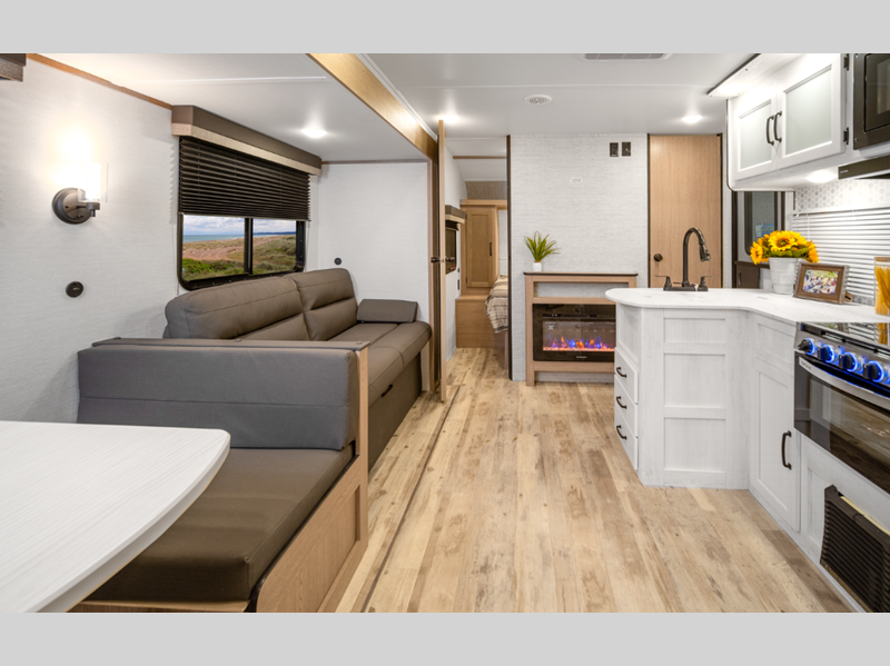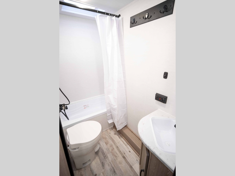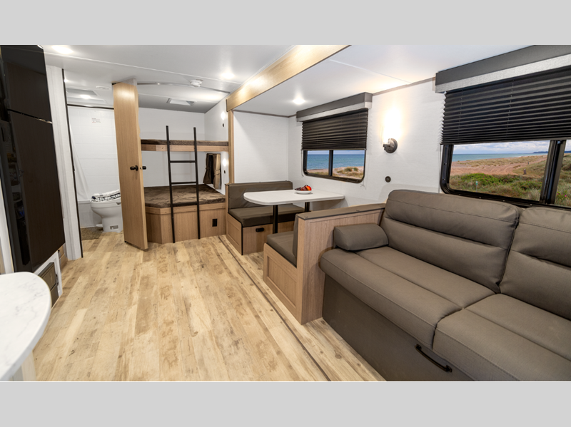 Sleeps 5 Slides 1 Length 23 ft 4 in Ext Width 8 ft Ext Height 10 ft 6 in Int Height 6 ft 8 in Hitch Weight 530 lbs Dry Weight 4430 lbs Cargo Capacity 1300 lbs Fresh Water Capacity 35 gals Grey Water Capacity 34 gals Black Water Capacity 34 gals Furnace BTU 20000 btu Number Of Bunks 2 Available Beds Queen Refrigerator Type Everchill Refrigerator/Freezer Refrigerator Size 10.7 cu ft Cooktop Burners 3 Number of Awnings 1 LP Tank Capacity 20 lbs Water Heater Type Tankless AC BTU 13500 btu Awning Info Electric with LED Lights Axle Count 2 Number of LP Tanks 1 Shower Type Tub/Shower Combo Electrical Service 30 amp Similar Floorplans