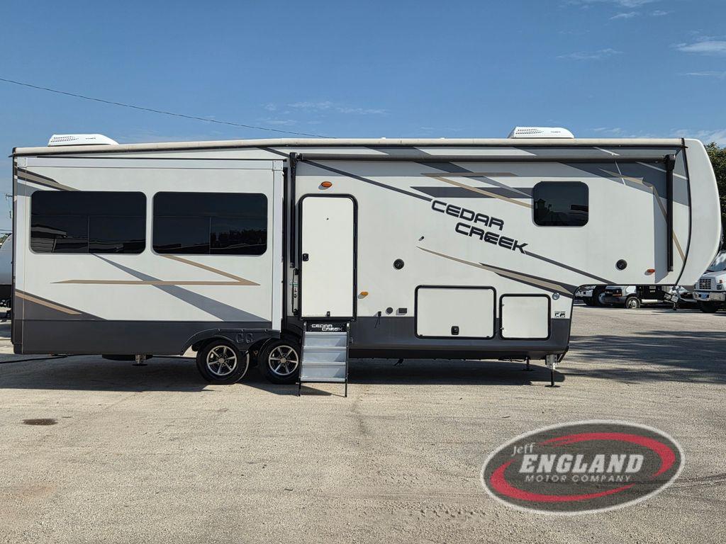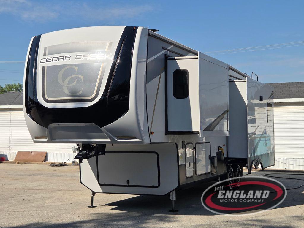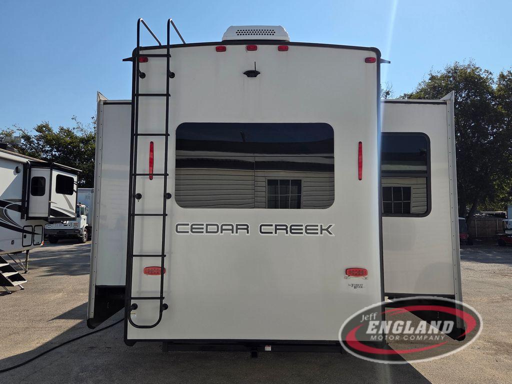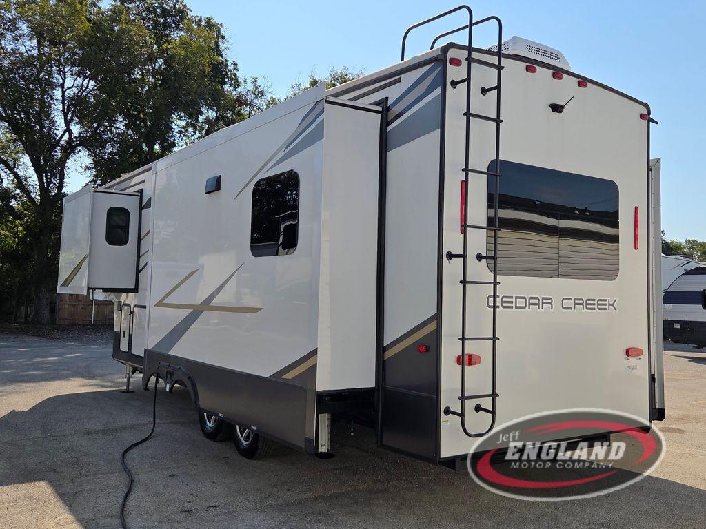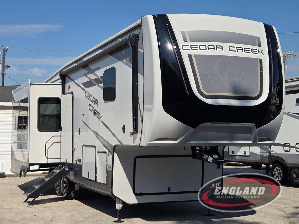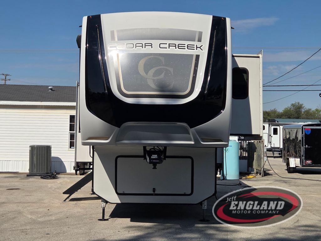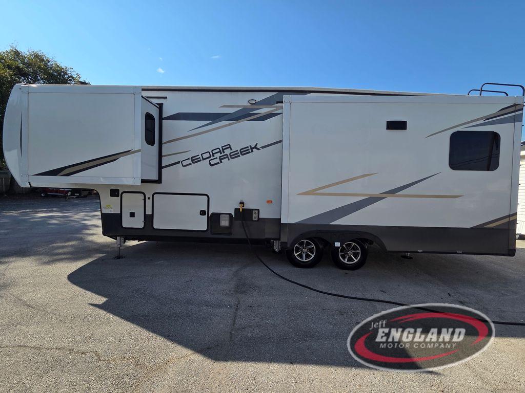 You will have peace of mind camping with any one of these Forest River Cedar Creek fifth wheels or fifth wheel toy haulers! Their aluminum superstructure, high gloss gelcoat exterior, and Dexter heavy duty axles with E-Z lube hubs will outlast all of your adventures. The Silaprene bonded sidewalls resist UV, heat, cold, oils, and highway chemicals with a bond that grows stronger with age while resisting delamination too. With the Vegatouch panel and Firefly dimmer switches, you can have total control of your unit in the palm of your hand. The exterior full docking station has multi-function tank levers, black tank flush, 12V battery disconnect, and an outside shower to keep the dirt where it belongs. The congoleum flooring throughout not only makes you feel right at home, but is also easy to clean. Come find the right model for you today!