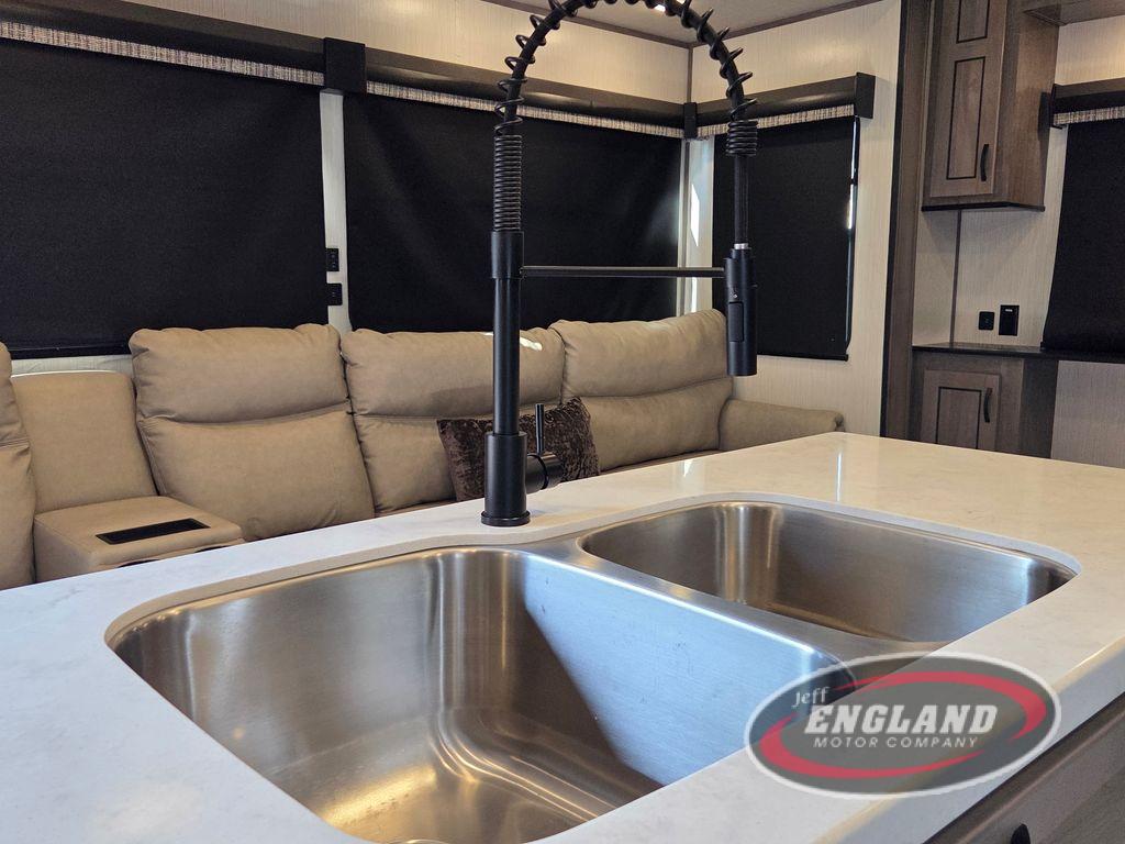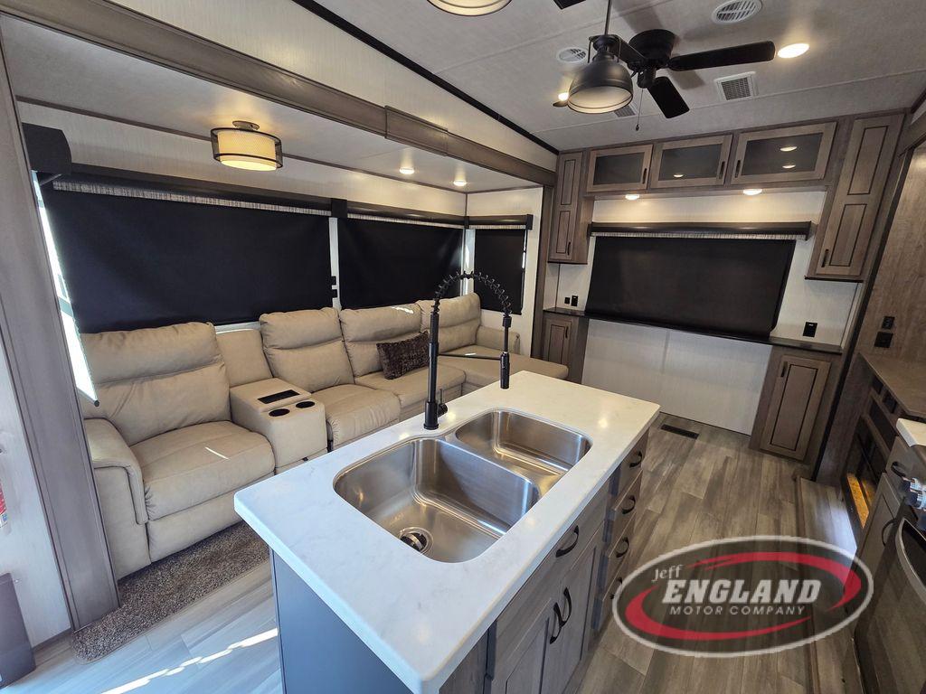 This fifth wheel will be the talk of the campground with a high bar top area in the rear living area! At night, relax on one of the two recliners or the chaise sofa while you watch your favorite movie on the 50" flat screen TV and enjoy the fireplace at the entertainment center. The kitchen island will make your meal prepping easier and if you choose to add the optional pull-out kitchen then you can breathe in some fresh air while you grill up some burgers on the two burner cooktop. The full bathroom has a 48" x 30" shower with a seat to freshen up in and a linen closet to keep your towels close. The front private bedroom has a front wardrobe with storage shelves and an area prepped to add an optional washer and dryer, plus a king bed slide for more walking around space and a comfortable place to lay your head at night!